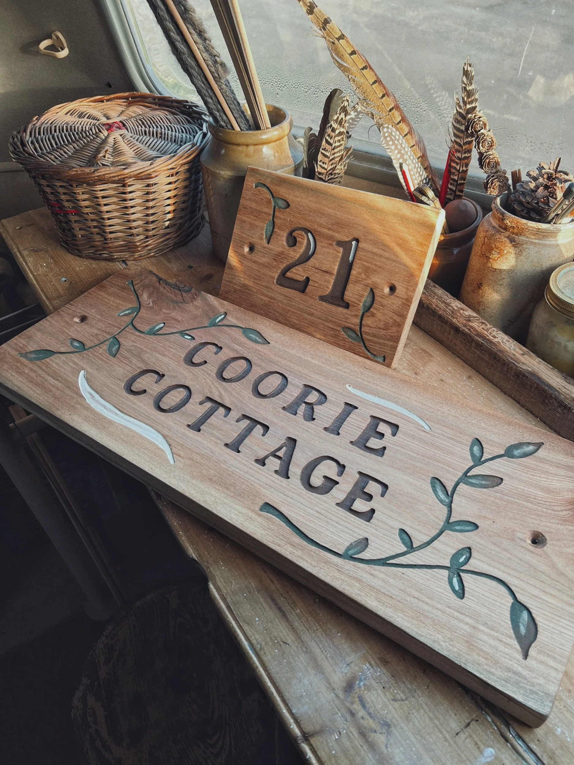 With my wooden signs, I’ve found myself naturally leaning into leafy designs, using rustic pieces of wood with lots of character and carving pieces of nature inspired decor into them. More recently, I’ve been inspired by traditional hand painted sing writing, and antique signs, finding ways to bring hints of those into my own work.