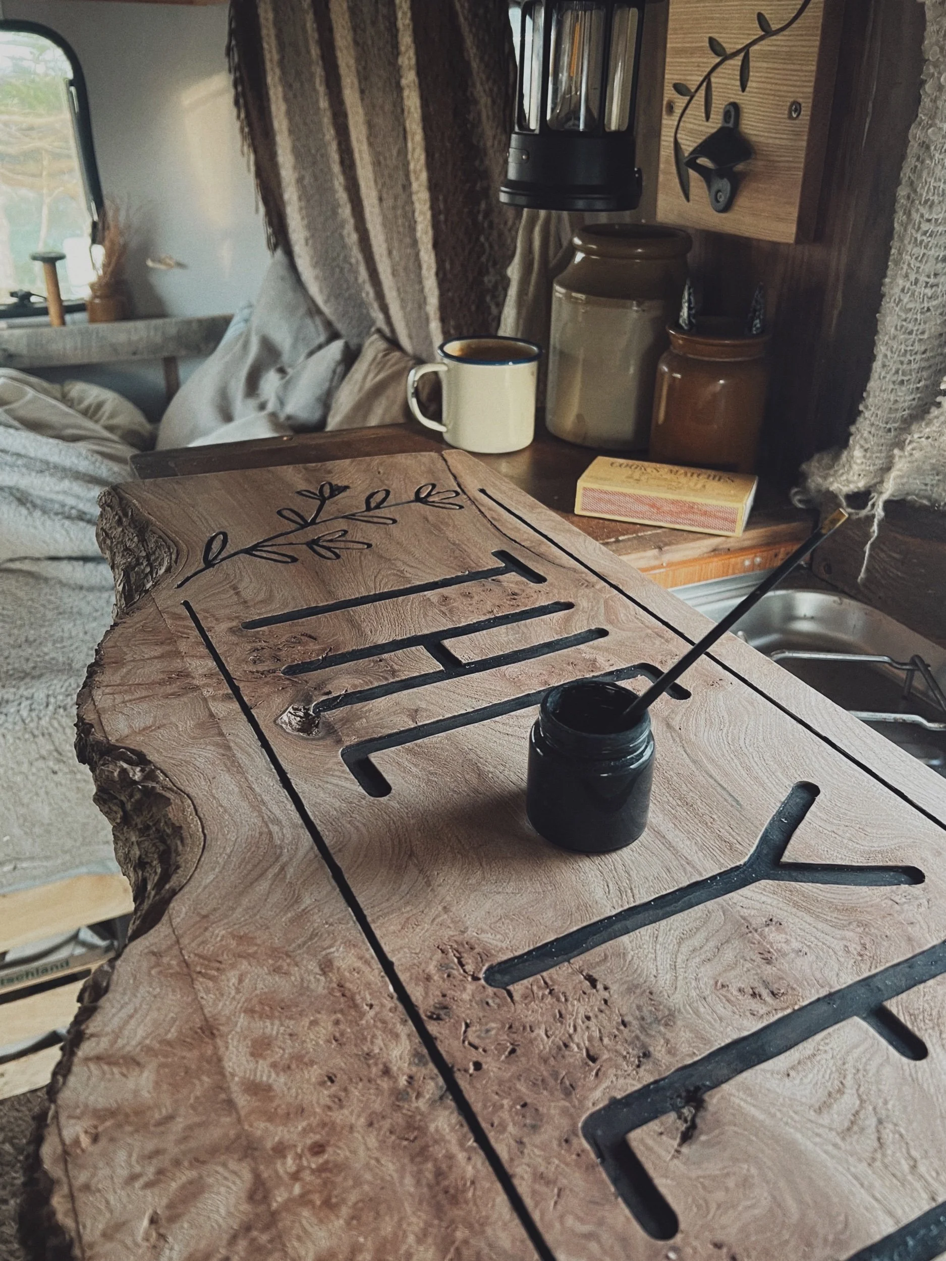 After watching workers create wooden signs for a campsite I was staying on, I bought a palm router and turned my storage shed into a tiny workshop cabin. You would’ve found me hunched over the bench in here, sawdust in my hair, a podcast playing, turning some piece of wood into something (I think so anyways) beautiful. Then, my workspace became portable again and you could find me working in the back of the LDV cabin van, routering on the step with mountains and forests behind me as we wandered around Scotland. Since then, I’ve had a bigger, practical workspace in Moray but have learnt that I’m terrible at putting down roots and it’s best for me to keep everything portable.
